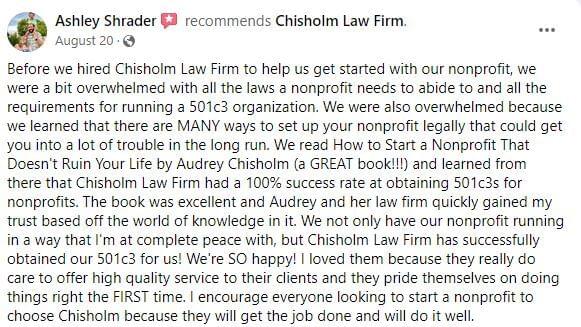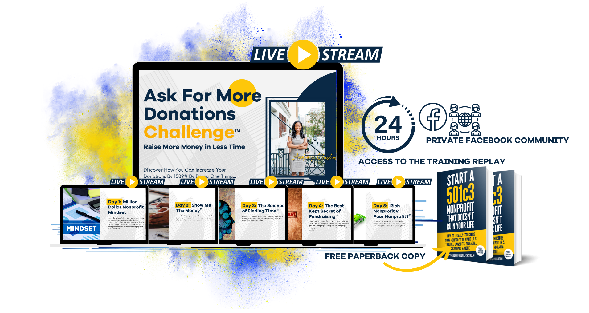 Earnings and income representations made by Audrey K. Chisholm, Ask for More Donations Challenge™, Chisholm Law Firm, PLLC, Start Your Tax Exempt Nonprofit, LLC, affiliates, sponsors, or advertisers (collectively, “Audrey K. Chisholm Enterprises”) are aspirational statements only of your earnings potential. The success of Audrey K. Chisholm, testimonials and other examples used are exceptional, non-typical results and are not intended to be and are not a guarantee that you or others will achieve the same results. Individual results will always vary and yours will depend entirely on your individual capacity, work ethic, business skills and experience, level of motivation, diligence in applying the Audrey K. Chisholm Enterprises Programs, the economy, the normal and unforeseen risks of doing business, and other factors.