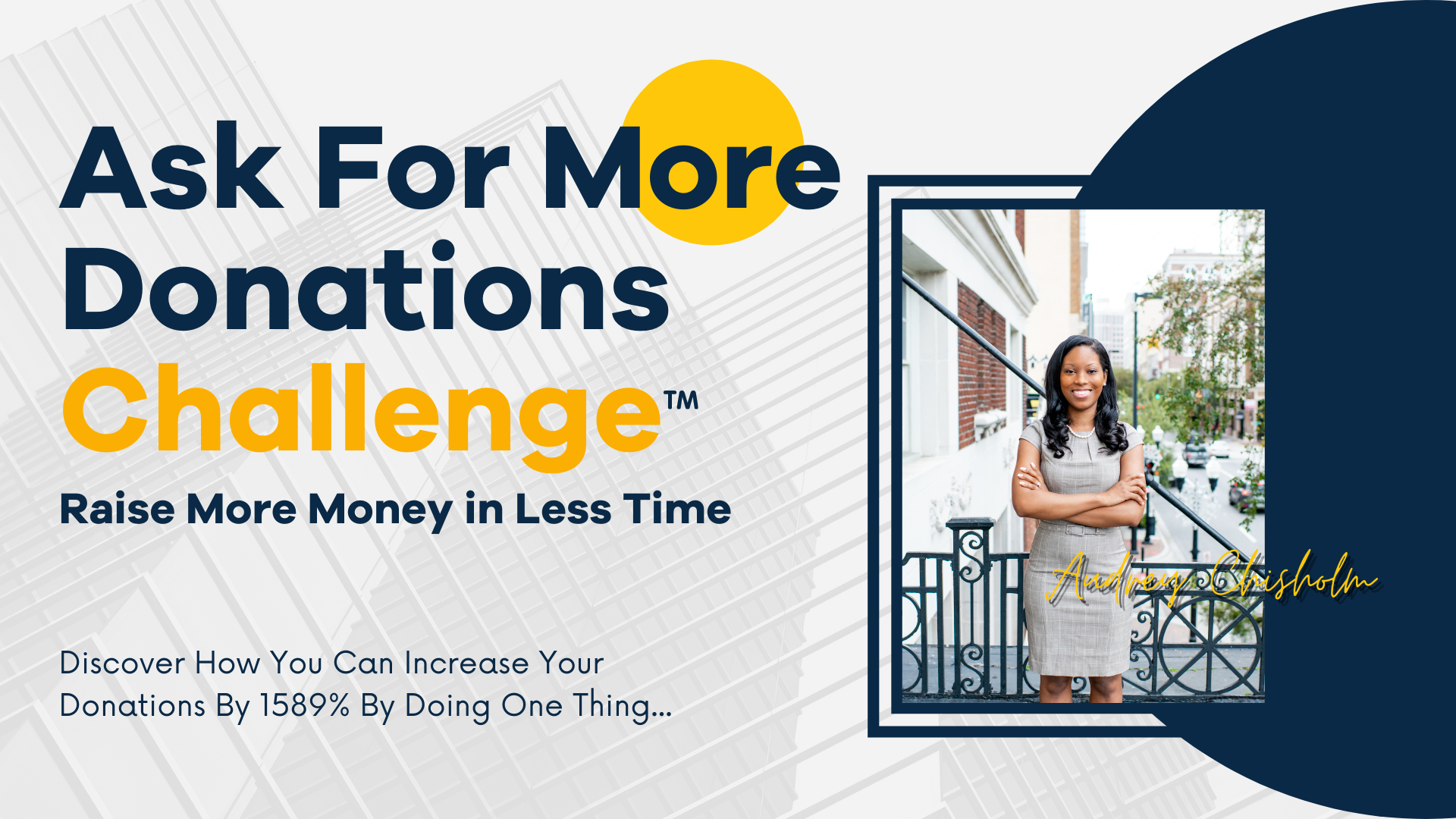 The Ask for More Donations Challenge™, and Audrey K. Chisholm individually, are not responsible for your actions. You are solely responsible for your own moves and decisions and the evaluation and use of our products and services should be based on your own due diligence. You agree that Audrey K. Chisholm Enterprises is not liable to you in any way for your results in using our products and services. See our Terms & Conditions or our full disclaimer of liability and other restrictions.